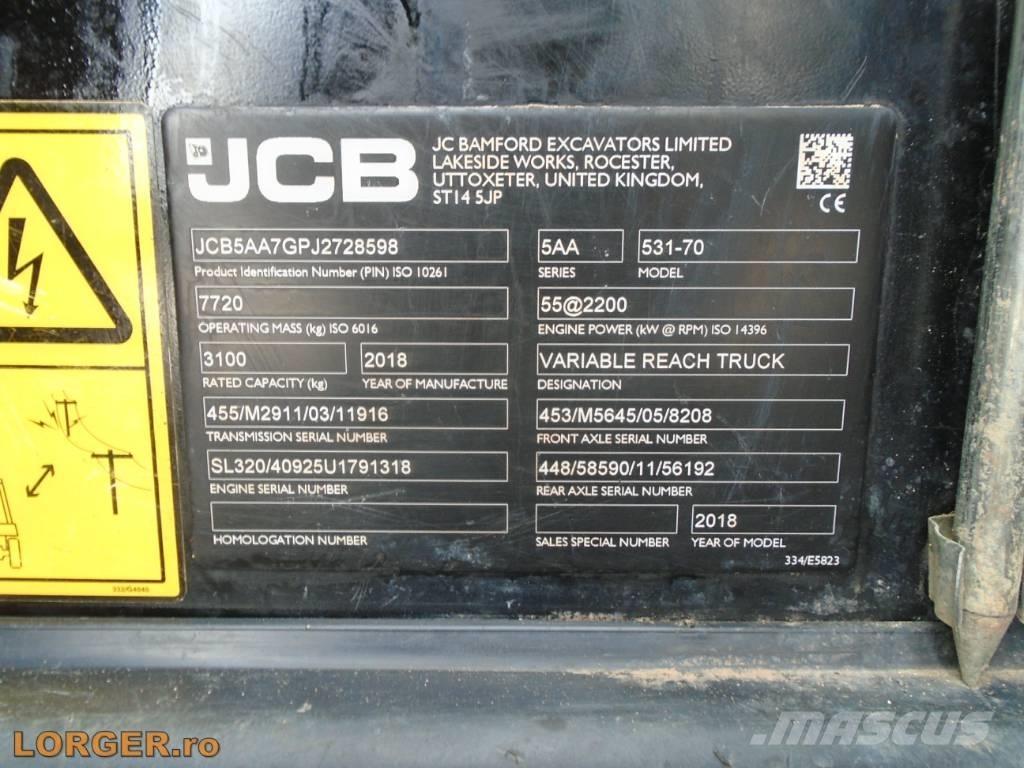 Incarcator telescopic JCB 531-70 din anul 2018, 4900 ore, capacitate max. de ridicare – 3.1 tone, inaltime max. de ridicare – 7 m, motor de 74 CP, furci pentru paleti + 1 cupa cereale, stare buna de functionare, import recent.